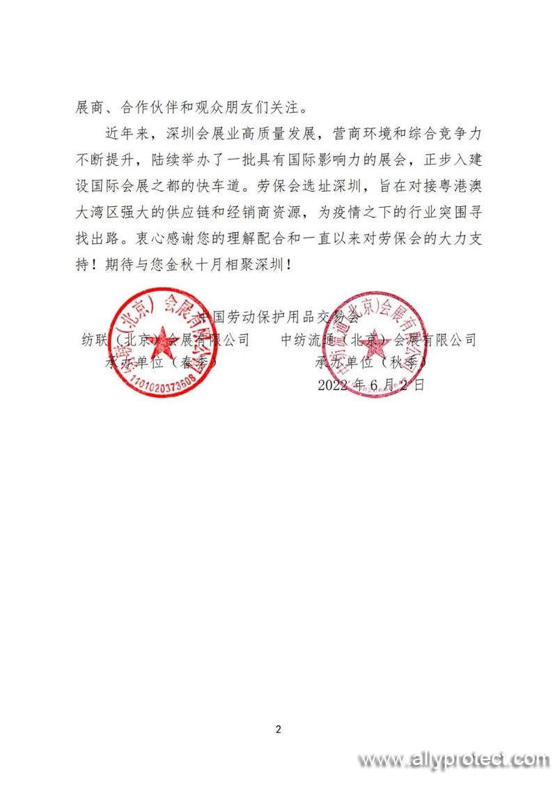 經(jīng)過近三個月的艱苦努力,上海人民堅持“動態(tài)清零”方針不動搖,終于迎來逐漸恢復(fù)正常生產(chǎn)生活秩序,我們向英雄的上海人民表示敬意!但我們同時必須認(rèn)識到,抗擊新冠肺炎疫情斗爭具有艱巨性、復(fù)雜性和長期性。為落實嚴(yán)防疫情發(fā)生規(guī)模性反彈的要求,堅持人民至上、生命至上,確保廣大參展商、合作伙伴和觀眾朋友們的身體健康,主辦方經(jīng)慎重研究,決定將延期至7月2日-3日舉辦的第104屆中國勞動保護(hù)用品交易會暨2022中國國際職業(yè)安全及健康產(chǎn)業(yè)博覽會(以下簡稱“勞保會”)再次延期至2023年4月13日-15日,舉辦地點仍為上海新國際博覽中心,館別不變,規(guī)劃不變。